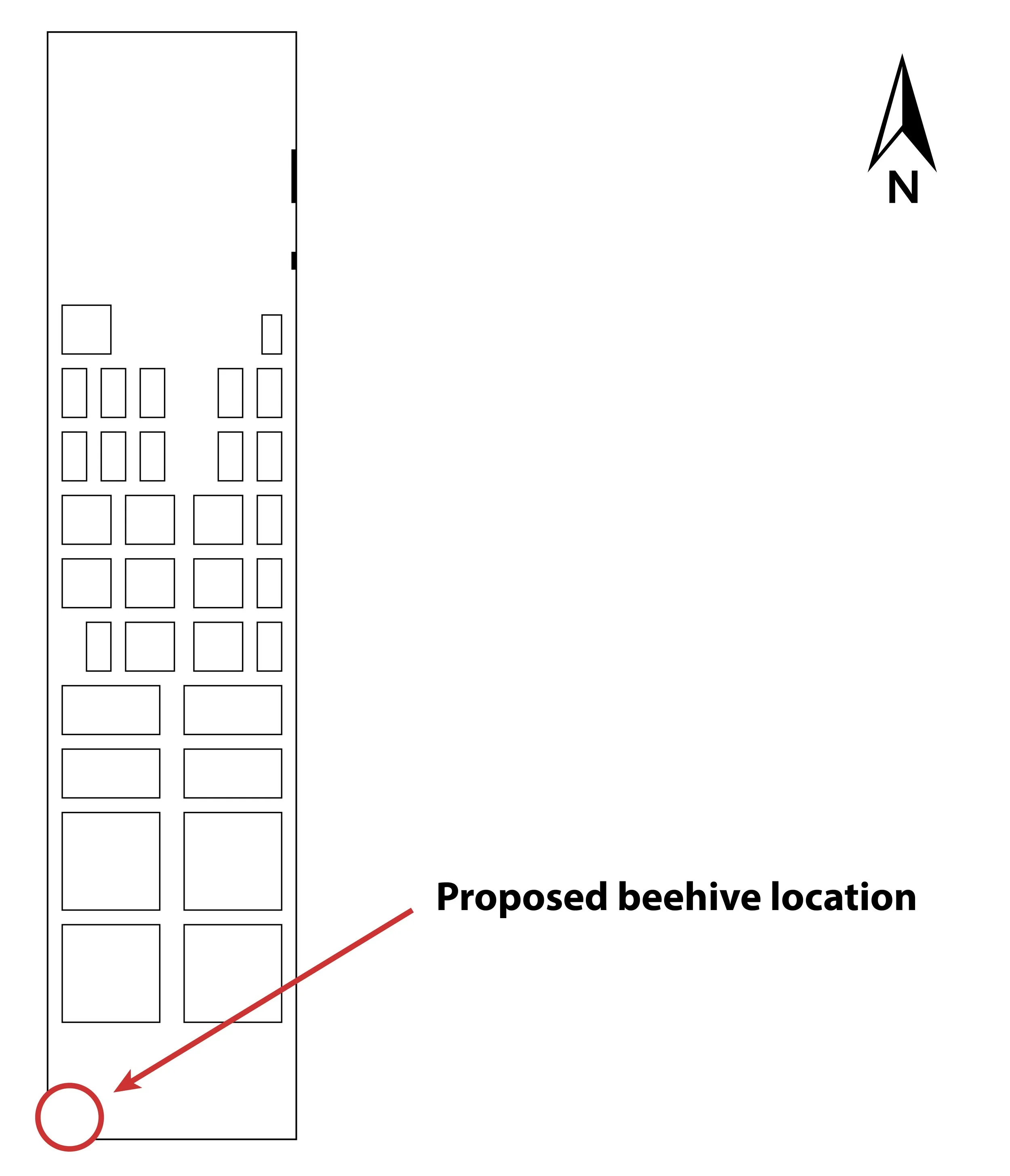 If approved, the hives will be located in the far southwest corner of the garden within a tall, sturdy barrier. See image: