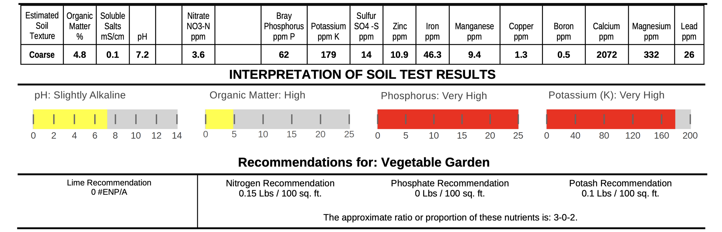 Most notable is the low level of lead in the soil, 26 parts per million (ppm). The U of M notes, “Generally, it has been considered safe to use garden produce grown in soils with total lead levels less than 300 ppm.”